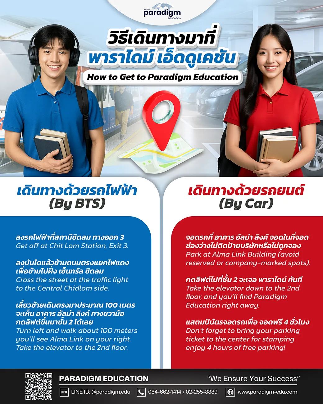 Contact Us บริษัท พาราไดม์ เอ็ดดูเคชัน จำกัด Paradigm Education Co., Ltd. Alma Link Building 2nd Fl. 25 Chidlom Ploenchit Rd. Lumpini Pathumwan BKK 10330 ติดต่อ คอร์สเรียนพาราไดม์ Tel: (662) 255 8889 Mobile: (668) 4662 1414 Email: contact@paradigm-edu.com Fax: (662) 655 2600 Line ID: @paradigm.edu ติดต่อ ศูนย์สอบพาราไดม์ Tel: (662) 255 8889 Mobile: (669)2 063 5599 Email: contact@paradigm-test.com Fax: (662) 655 2600 Line ID: @paradigm.test How to Gat to Paradigm Education