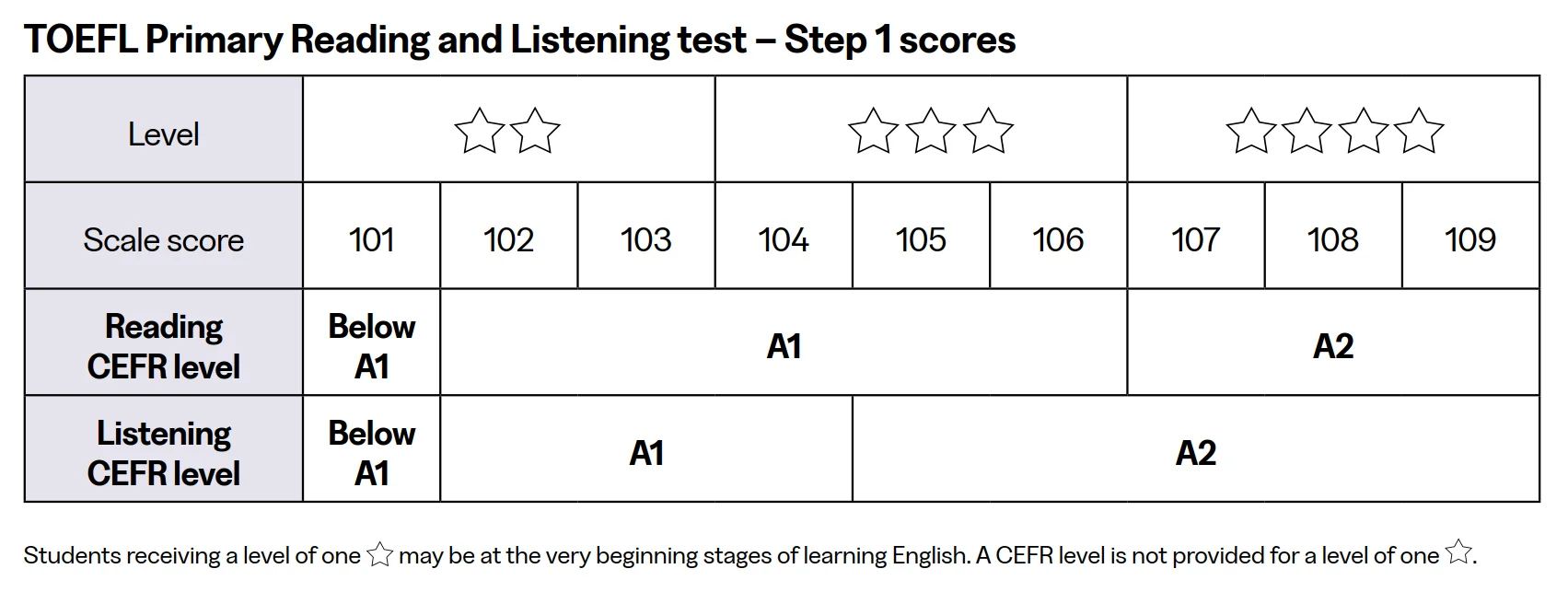 📌 ข้อควรรู้: สำหรับน้องๆ ที่ได้คะแนนระดับ 1 ดาว อาจจะยังอยู่ในช่วงเริ่มต้นเรียนรู้ภาษาอังกฤษมากๆ จึงยังไม่มีการระบุระดับ CEFR ให้