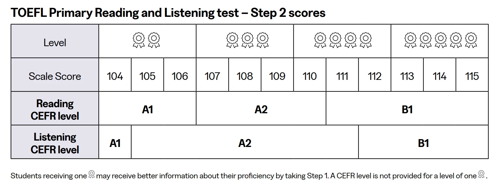 📌 ข้อควรรู้: หากน้องๆ สอบ Step 2 แล้วได้คะแนนประเมินอยู่ที่ระดับ 1 (1 เข็มกลัด) แนะนำให้ลองกลับไปสอบแบบ Step 1 เพื่อให้ได้ข้อมูลวัดระดับที่เหมาะสมกับความสามารถมากกว่าครับ (ไม่มีการระบุระดับ CEFR สำหรับระดับ 1)